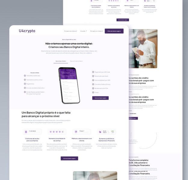 A solução criada foi um estética minimalista que conta com as tendências de design utilizadas nos benchmarks de bancos e empresas digitais, porém com um toque humano que destaca fotografias de pessoas com perfis semelhantes aos seus clientes, com o objetivo de criar uma identificação e familiaridade. Outro ponto chave foi a aplicação d eum copywriting focado em esclarecer a proposta de negócio da U4C: uma empresa que auxilia negócios na criação de bancos digitais. Seus conteúdos “direto ao ponto” suprem as principais dúvidas e dores de seus leads e prospects.