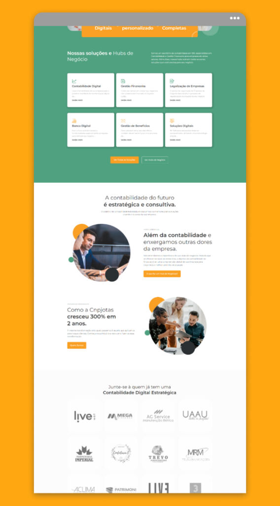 Em um momento de transição da empresa tanto de marca quanto de negócio, a Cnpjotas precisava de ajuda para desenvolver um website capaz de manter sua autoridade no cenário da contabilidade e também inserir suas novas soluções de hubs. Portanto, o nosso desafio foi criar uma interface que fosse capaz de conter uma estrutura de informações complexa e que ao mesmo tempo contasse a história da empresa, inserindo seus antigos e novos clientes em uma nova fase da Cnpjotas de forma a ficar claro as intenções e cada serviço oferecido